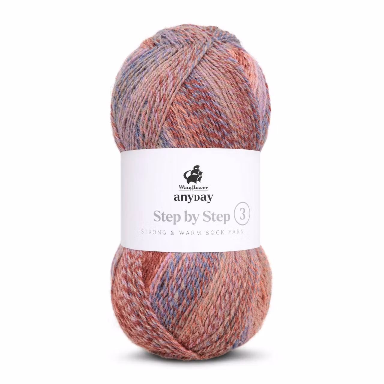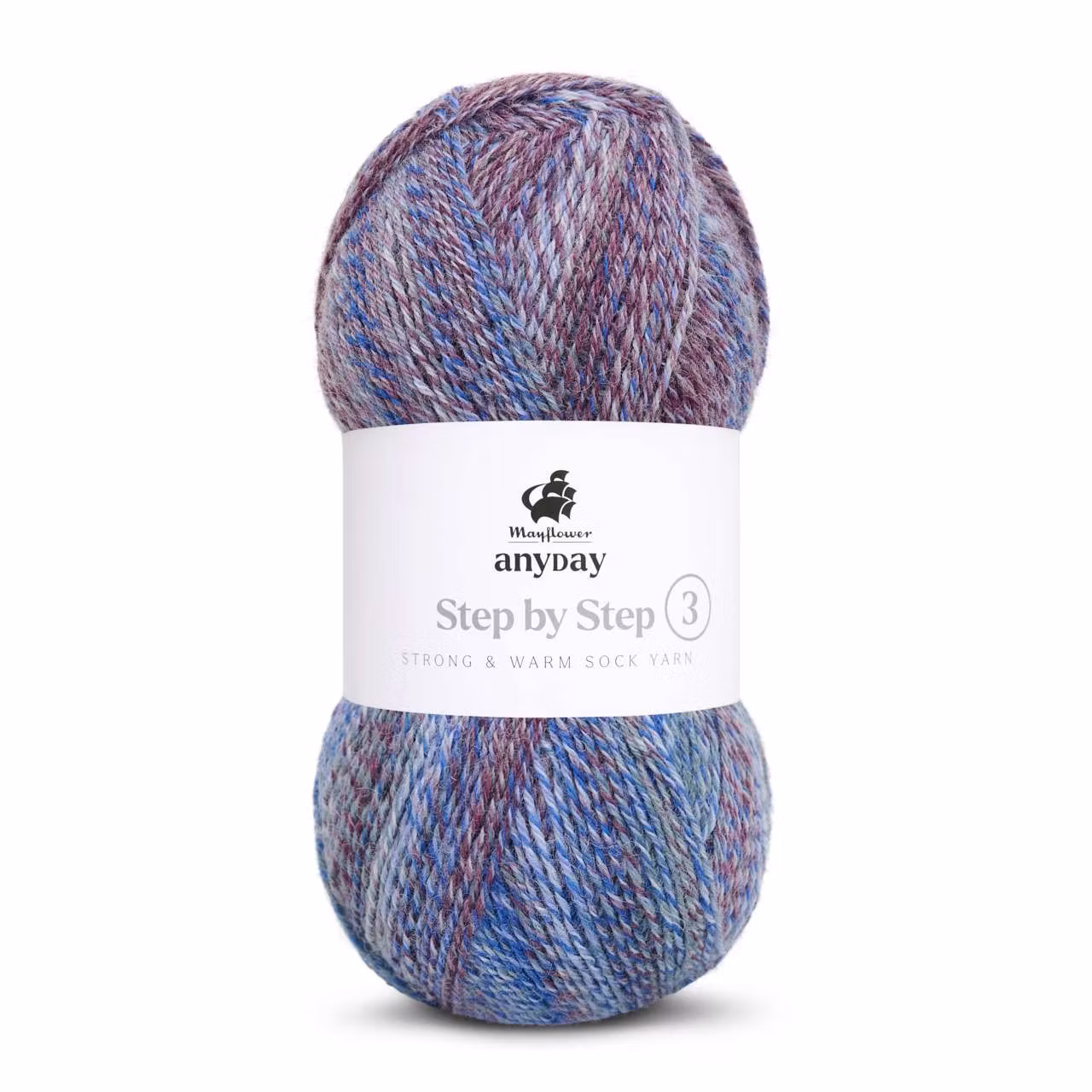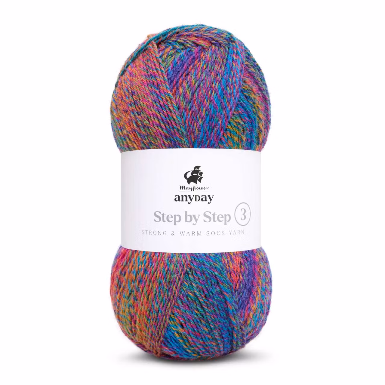 ANYDAY Step by Step 3 är ett hållbart och mjukt sockgarn med vackra färgskiftningar. Perfekt för varma, tåliga strumpor.