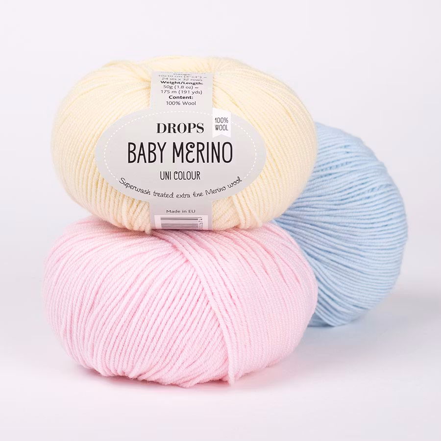 Extra mjukt merinogarn i 100 % ull. DROPS Baby Merino är perfekt till babyplagg, filtar och mössor – tvättbart och fritt från kemikalier.