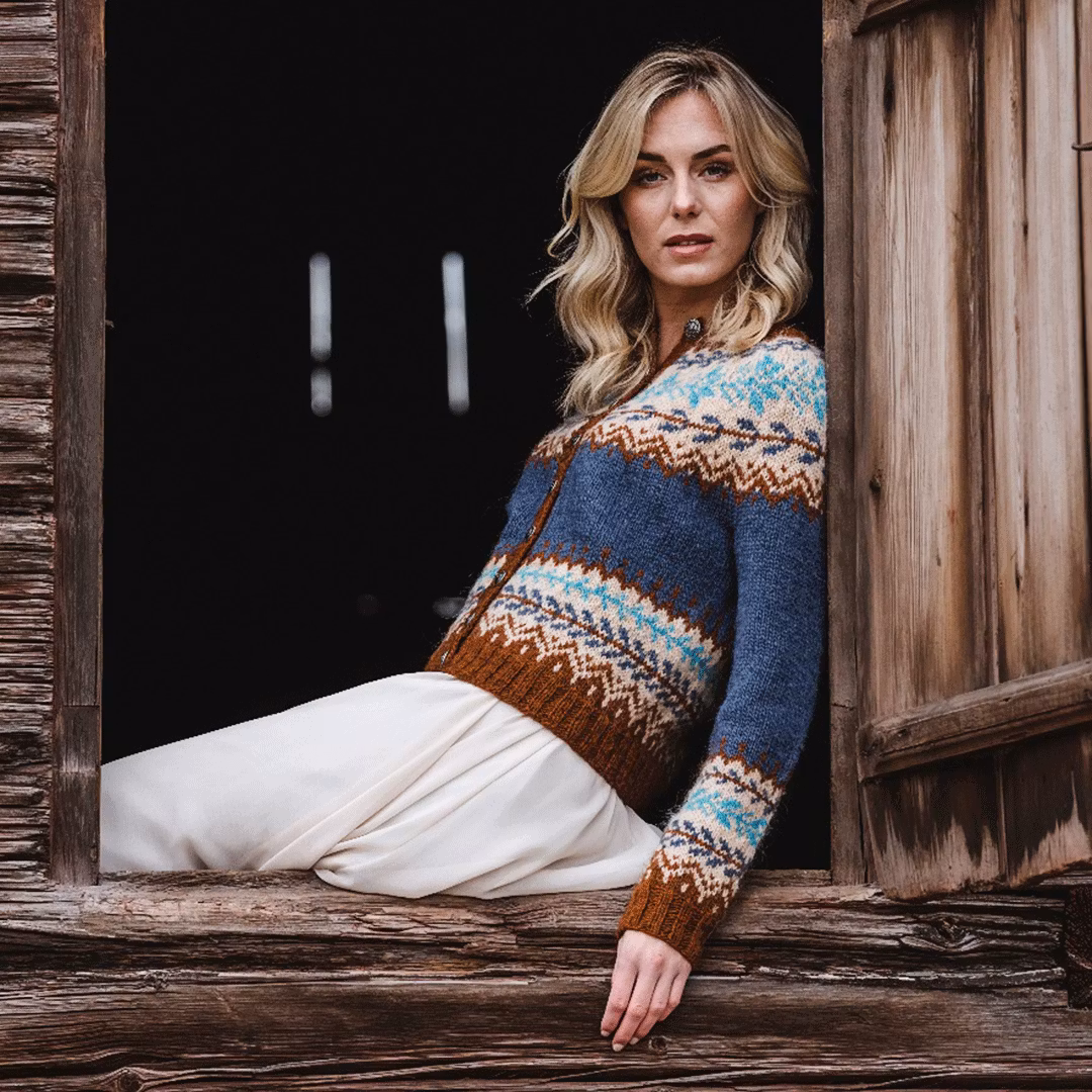 Maja är en kort och modern islandskofta med mönsterstickat ok, inspirerad av traditionella isländska tröjor. Det dekorativa oket får sällskap av ett upprepat mönster på ärmarnas nederdel – här i en extra lång och uttrycksfull variant.