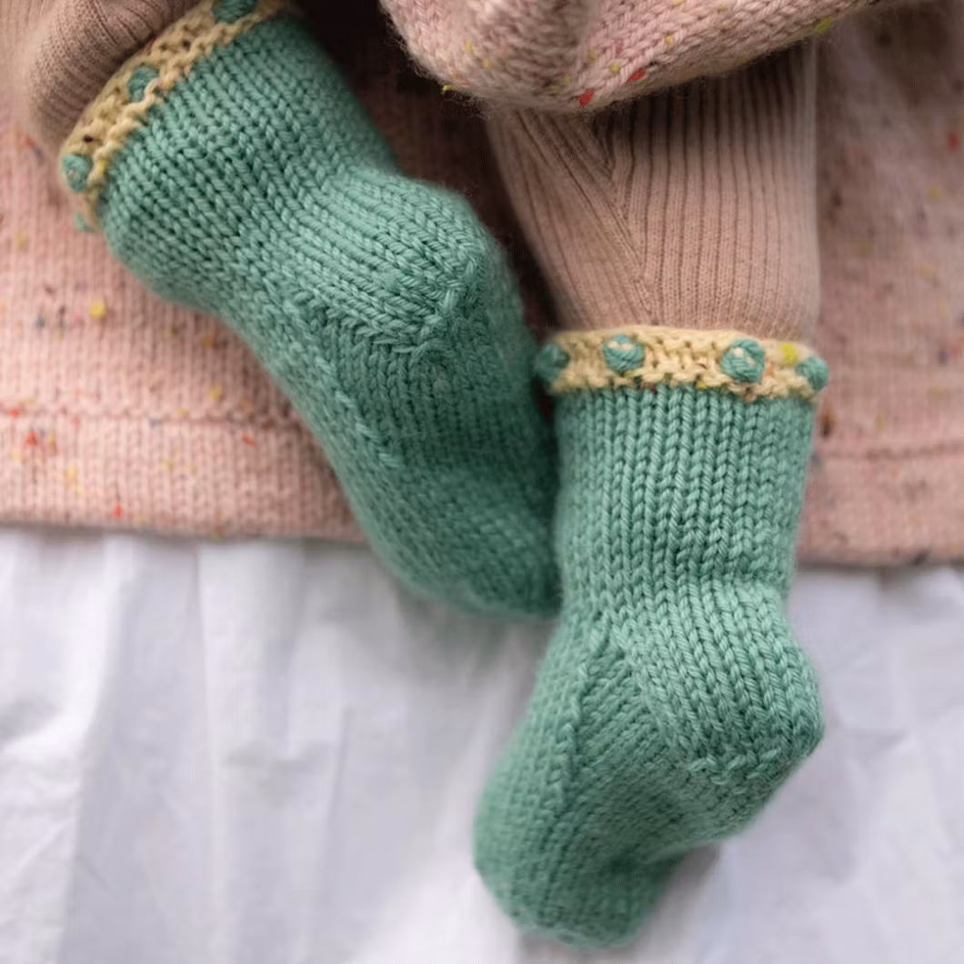 Sockorna stickas uppifrån och ner och pryds av en dekorativ popcornbård som ger ett extra fint och genomarbetat uttryck. En charmig detalj som gör de små sockorna både unika och perfekta som present till en ny liten familjemedlem.