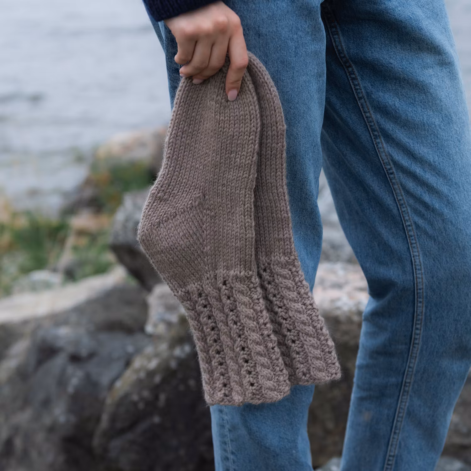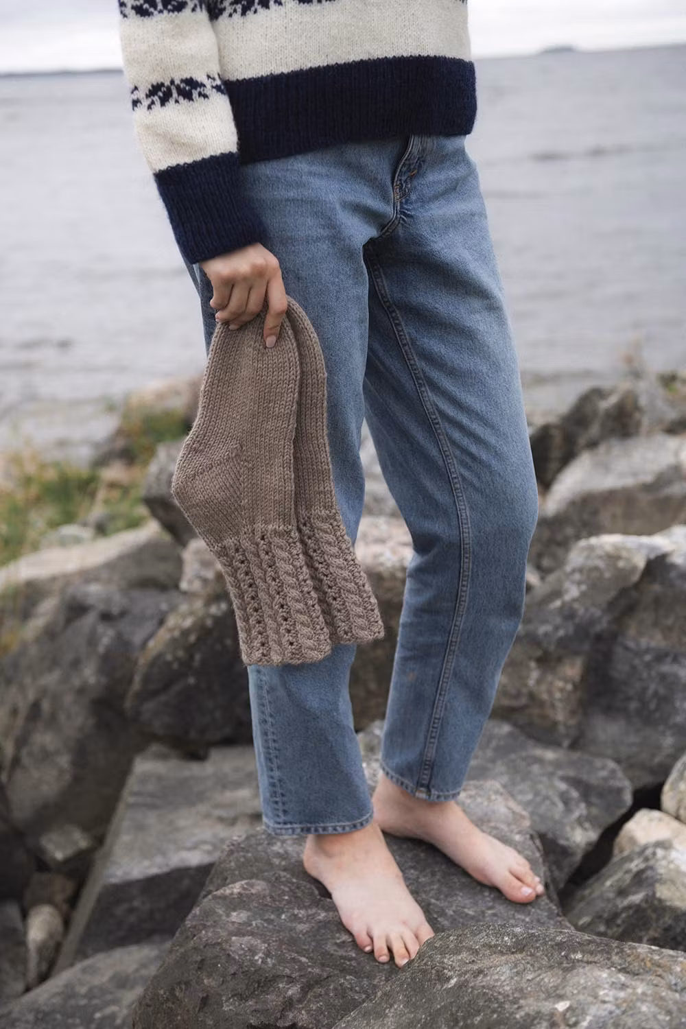 Kobbe är ett stickmönster på klassiska raggsockor med flätstickning och fleegle heel. Skaftet pryds av en panel som kombinerar flätor och ett enkelt spetsmönster – perfekt för dig som vill prova både flätor och spets i samma projekt. Sockorna värmer gott under svala sommarkvällar och passar lika fint i gummistövlarna på båtturen som hemma i soffan. Ett tekniskt men lättillgängligt projekt med tydlig struktur och klassisk känsla.