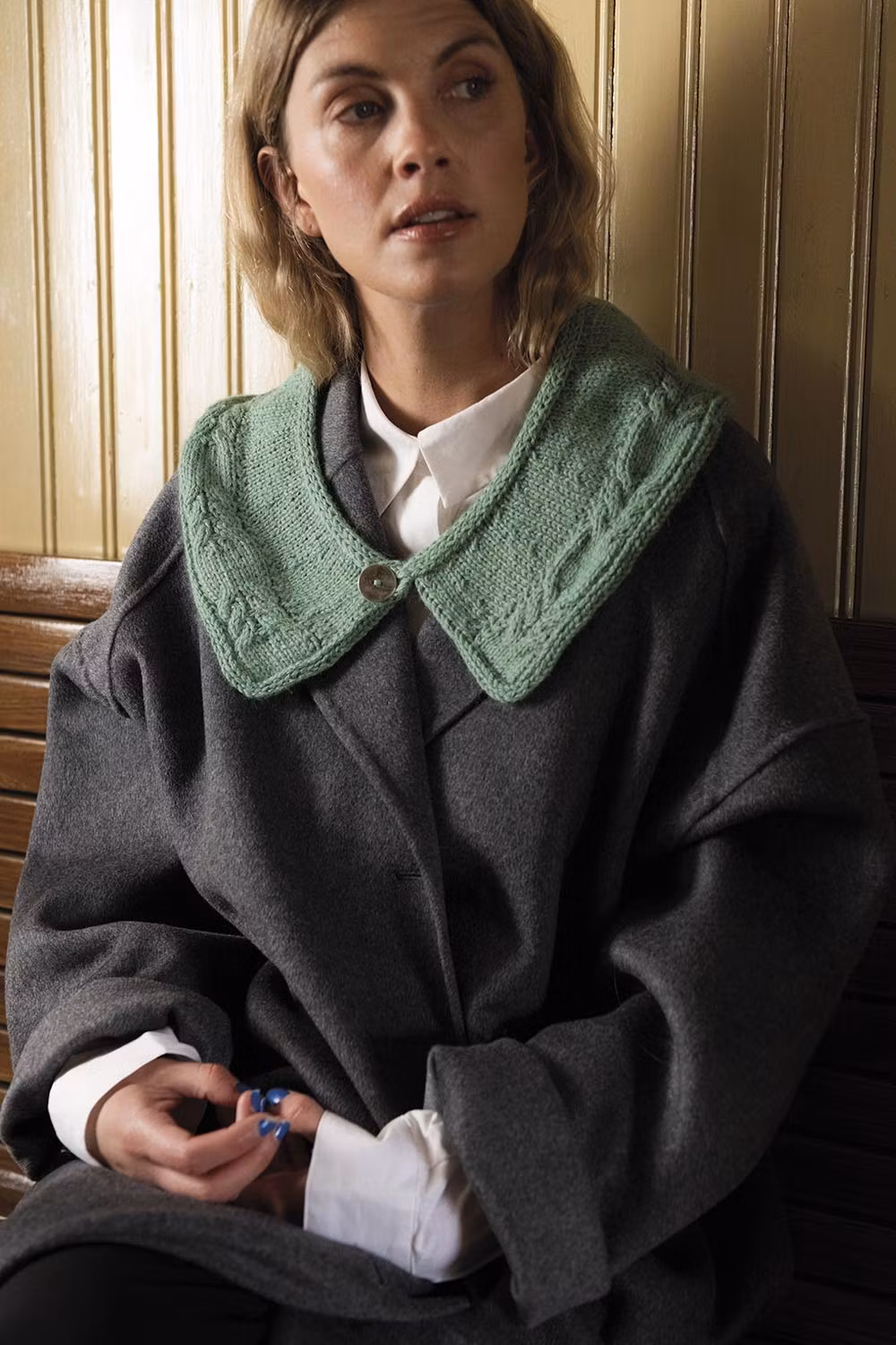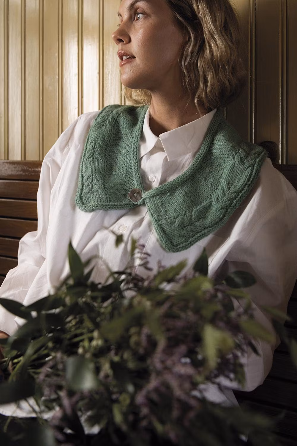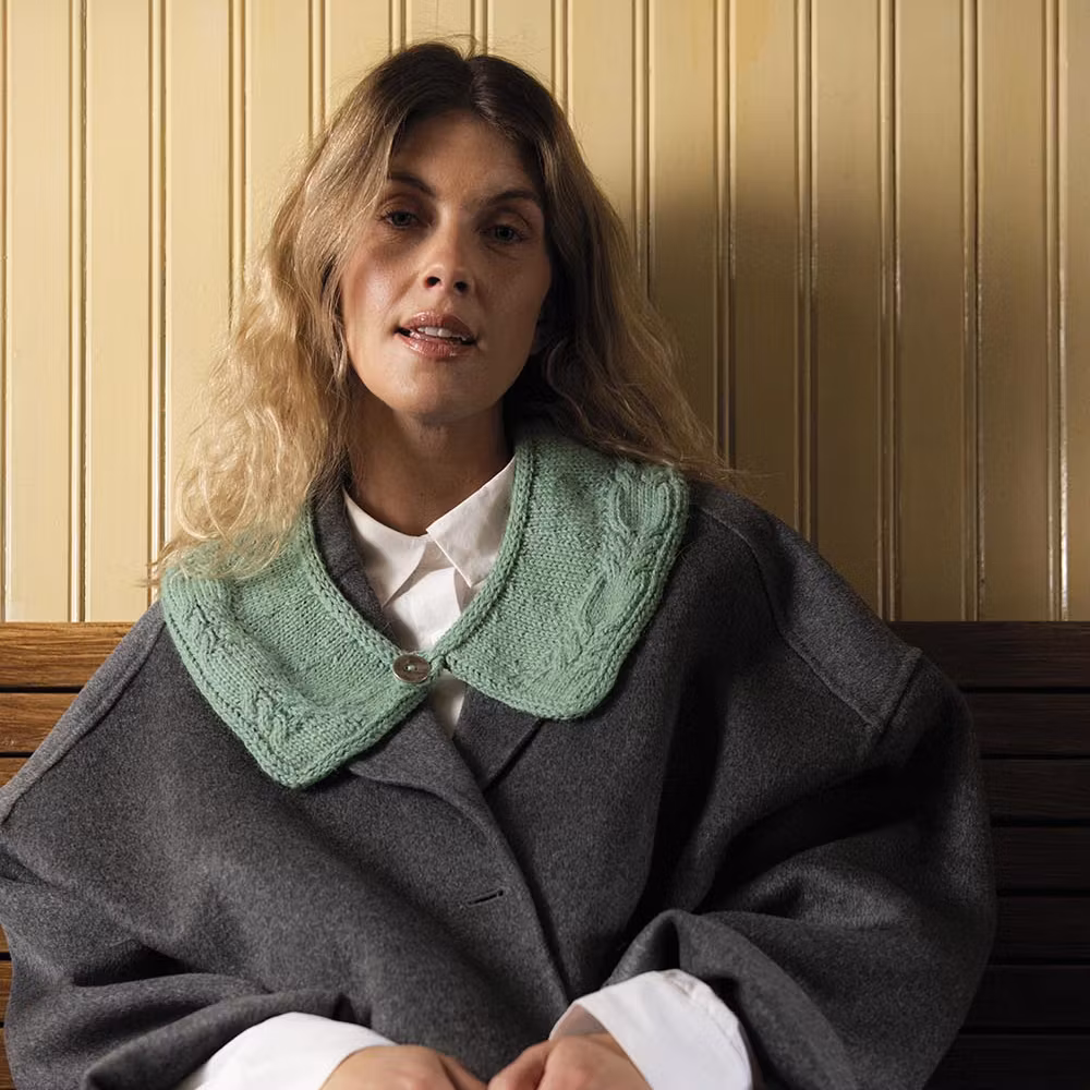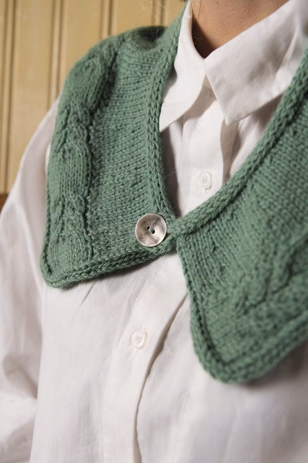 Kupé är ett stickmönster på en löskrage med flätmönster. Två stängningsalternativ – knapp eller knytband och med elegant i-cordavslut.