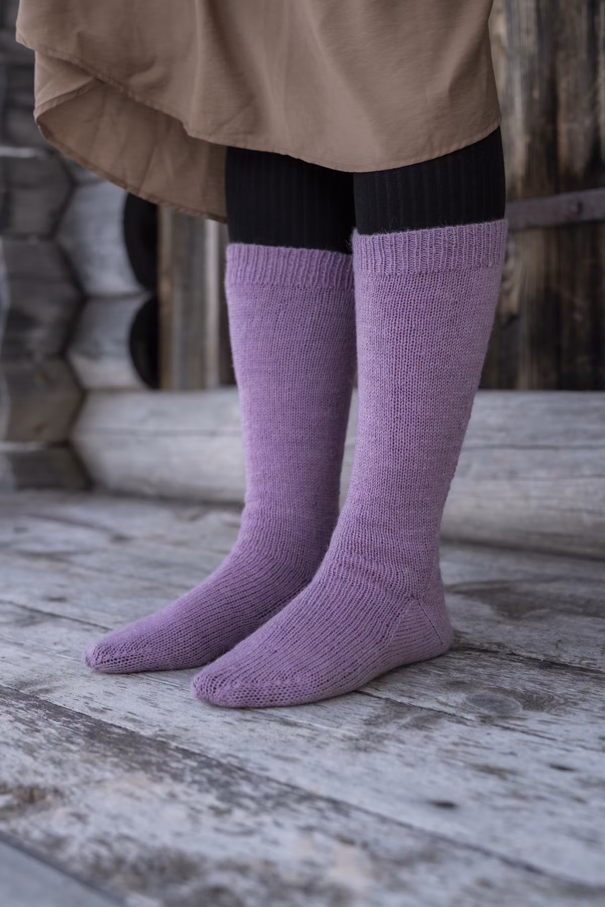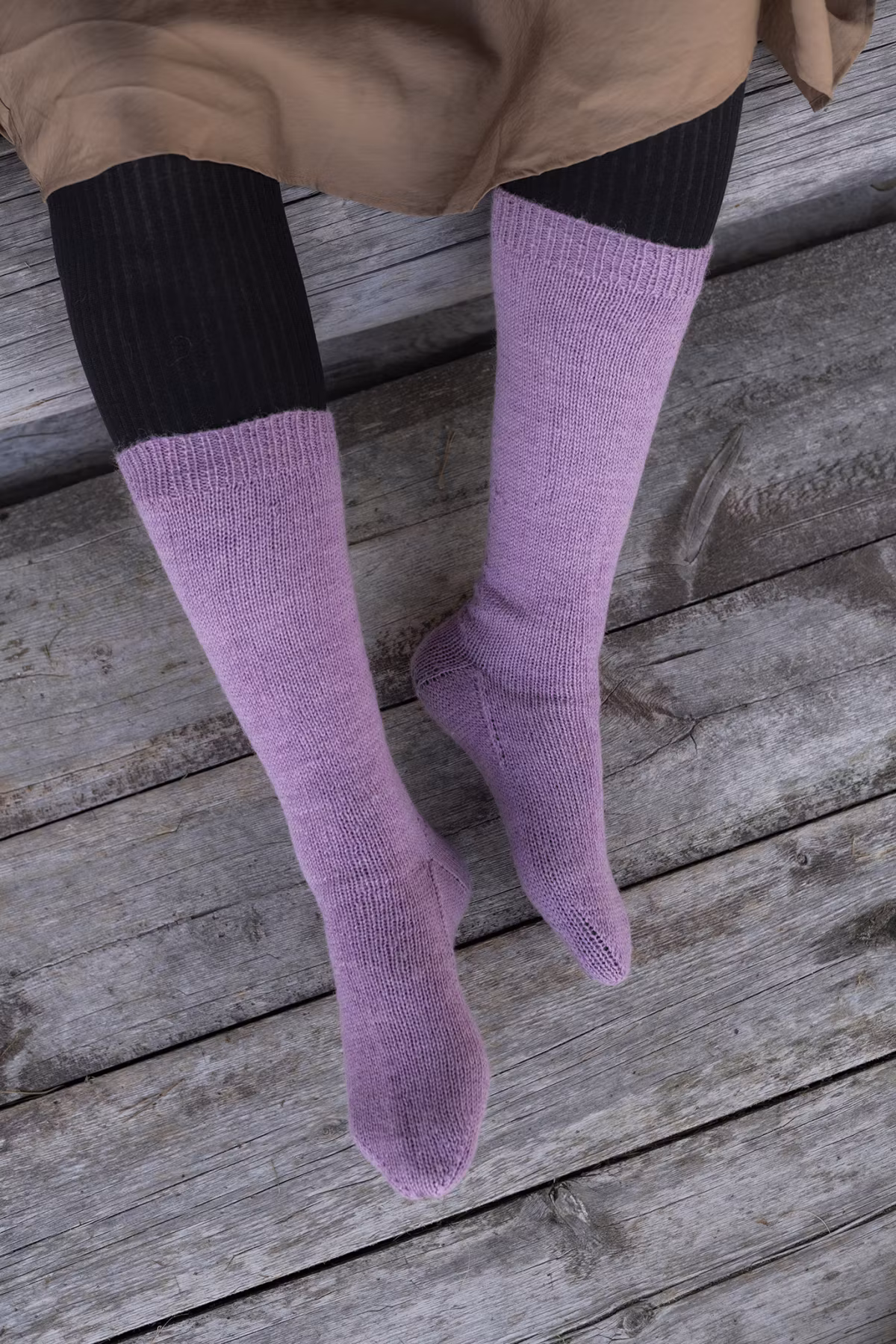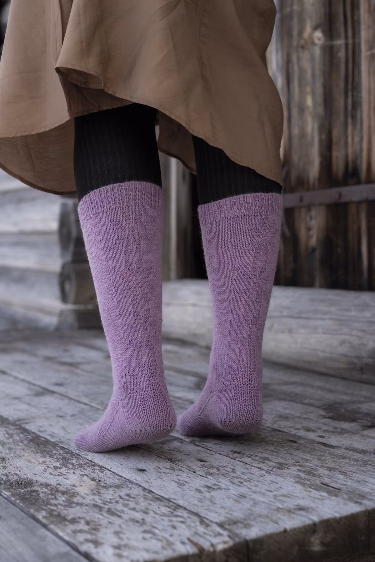 Nordstjärna är ett stickmönster på eleganta, enfärgade knästrumpor som stickas uppifrån och ner. Längs baksidan löper en rad klassiska stjärnor som ger ett dekorativt och tidlöst uttryck. Ett stilrent projekt som kombinerar traditionell sockstickning med en tydlig detalj – perfekt för dig som vill sticka något både användbart och personligt.