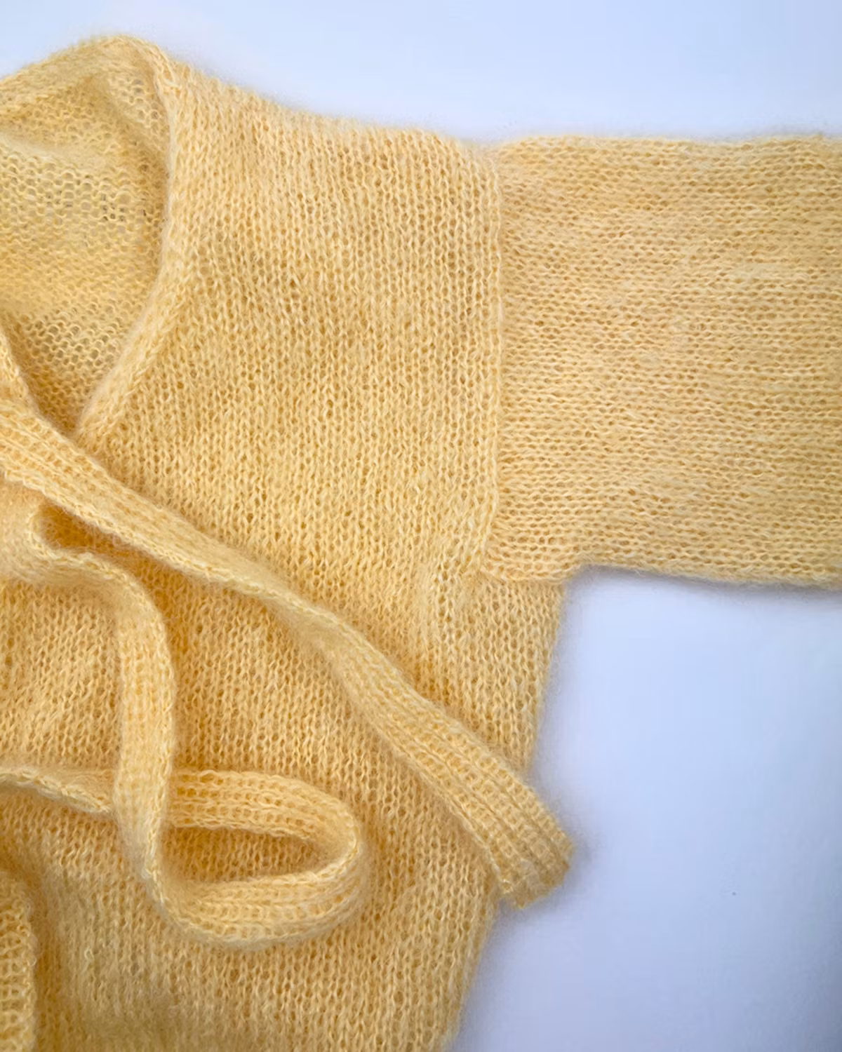 Det här är en mjuk omlottkofta med ett avslappnat men genomtänkt uttryck. Omlottformen ger en smickrande silhuett och gör koftan enkel att anpassa efter hur du vill bära den – knuten tätt intill eller mer ledigt. Modellen stickas i slätstickning och får ett luftigt fall tack vare det mjuka garnet Bella.