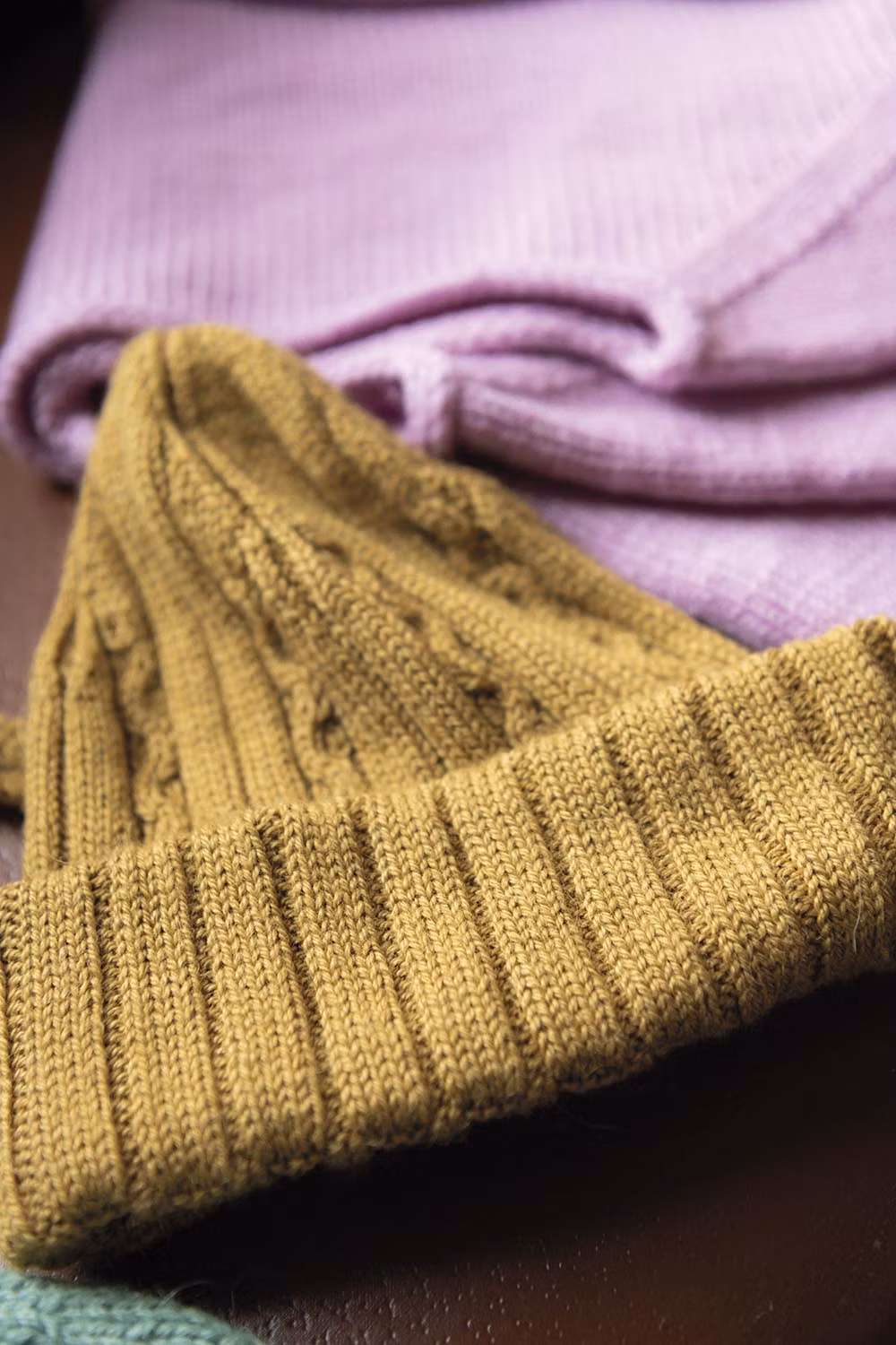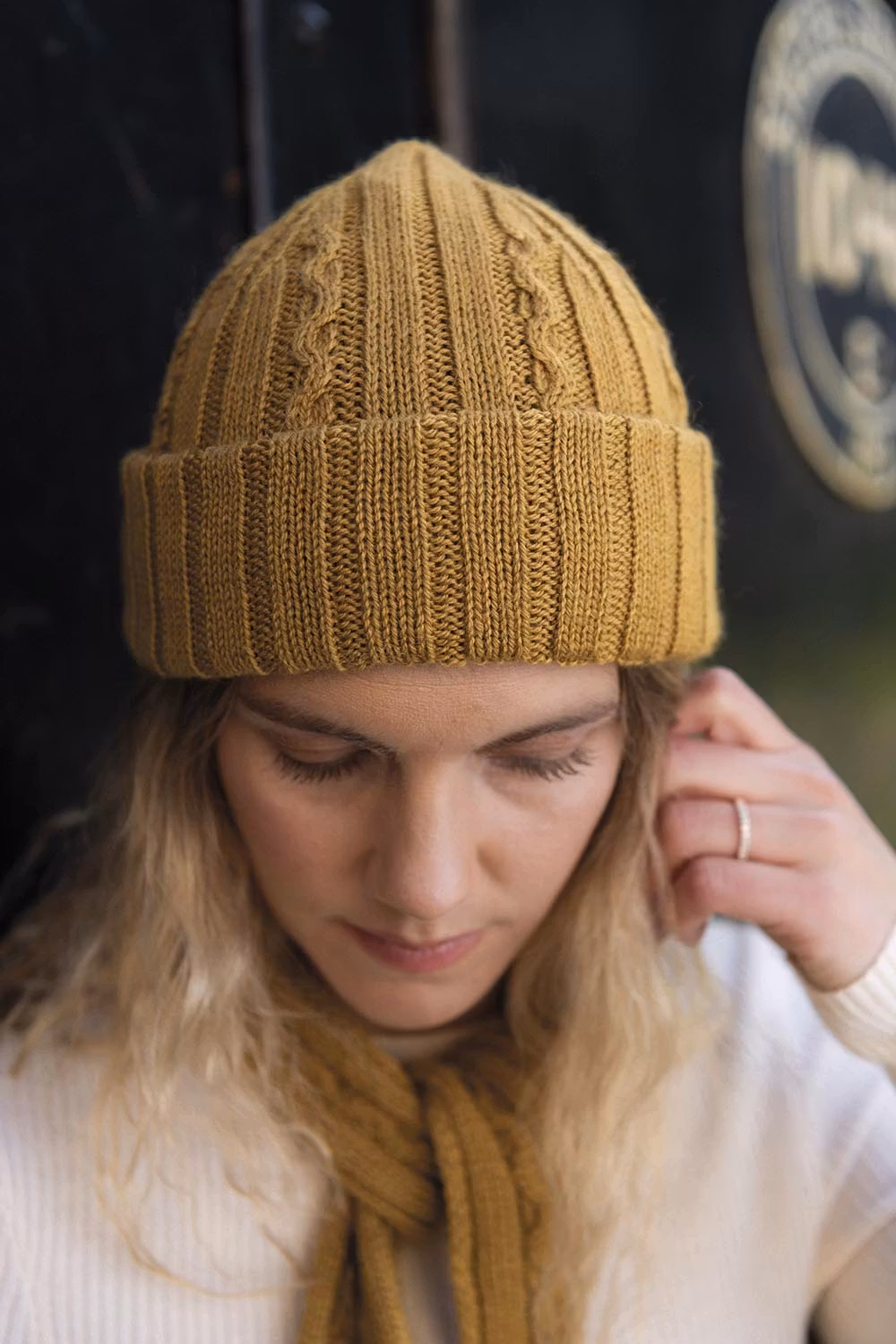 Stickmönster på Räls mössa med diskreta flätor. Resårstickad modell i sotarmössestil som passar perfekt till Räls scarf.