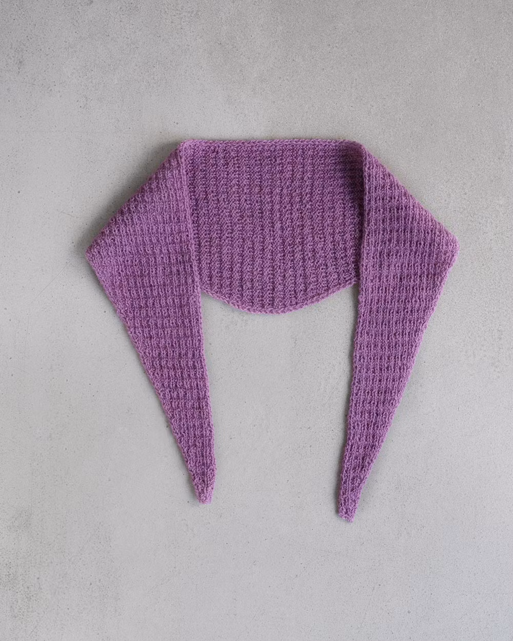 Scarfen stickas från spets till spets. Arbetet inleds med ökningar längs ena kanten tills full bredd uppnåtts, därefter formas plagget genom minskningar tillbaka till spets. Resultatet blir en följsam scarf med tydlig struktur och vacker form.
