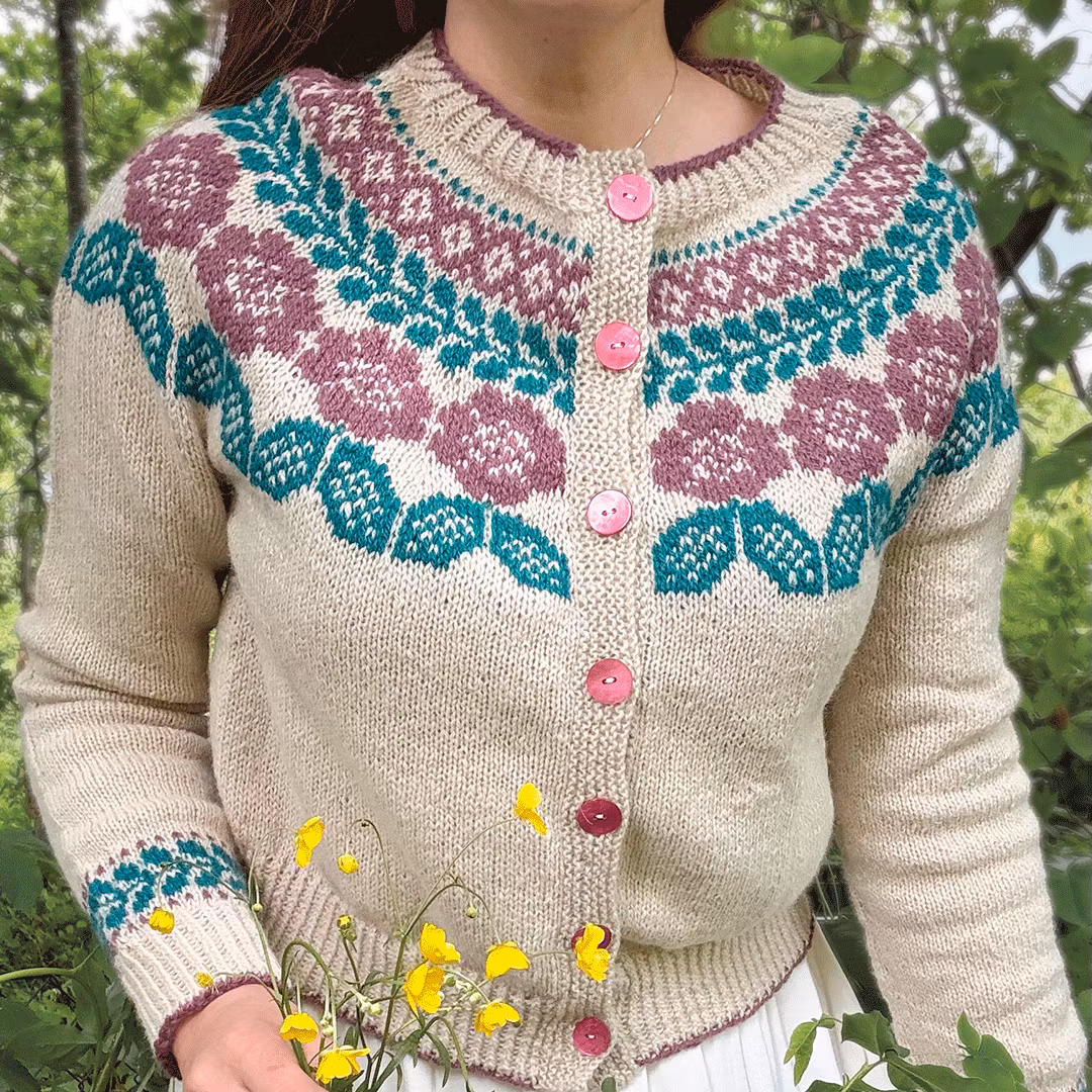 Stickmönster till Sommarkoftan 2025. Flerfärgsstickad kofta i Svensk 2-trådig ull eller Fin Alpacka. Ladda ner digitalt eller beställ för tryckt mönster.