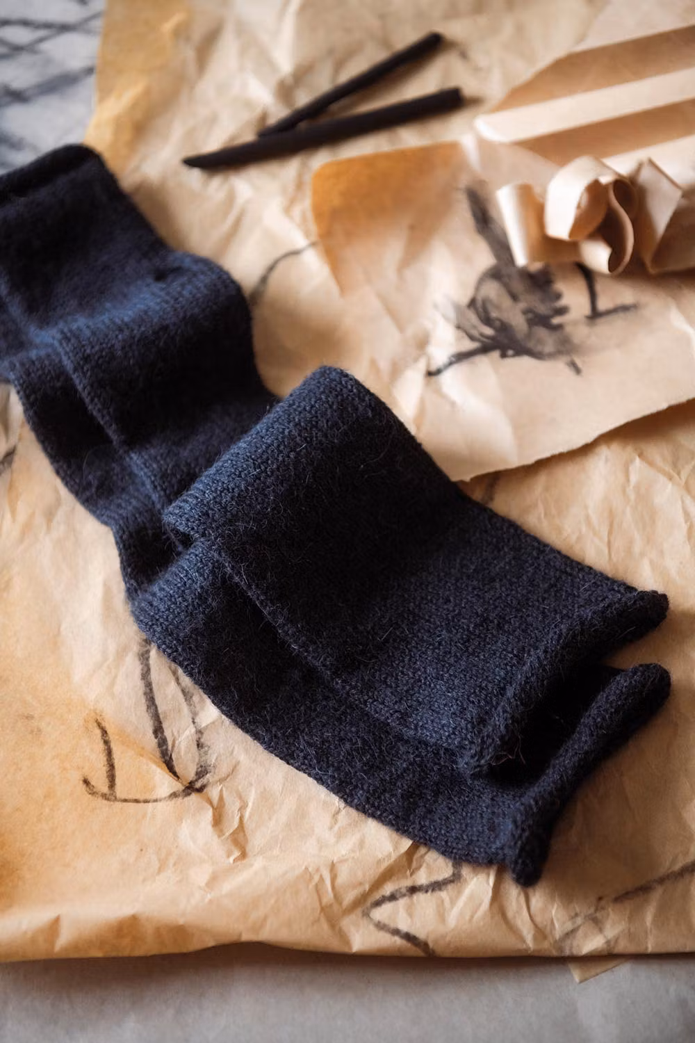 En diskret formstickning runt handleden ger en bekväm passform, medan den extra långa mudden bidrar med både värme och mysfaktor. Vantarna stickas från handen och ner mot mudden, vilket gör det enkelt att justera längden efter önskemål.