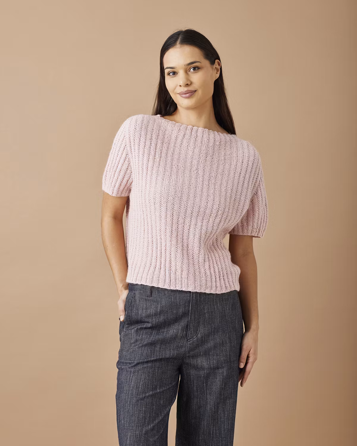 Det här är en elegant och lätt T-shirt med ett rent uttryck och fina detaljer. Modellen har sadelaxlar och en båthals som ger en modern och genomtänkt silhuett. T-shirten stickas i dubbelt garn med mönsterstickning, vilket ger både struktur och stadga samtidigt som plagget känns mjukt och behagligt att bära.