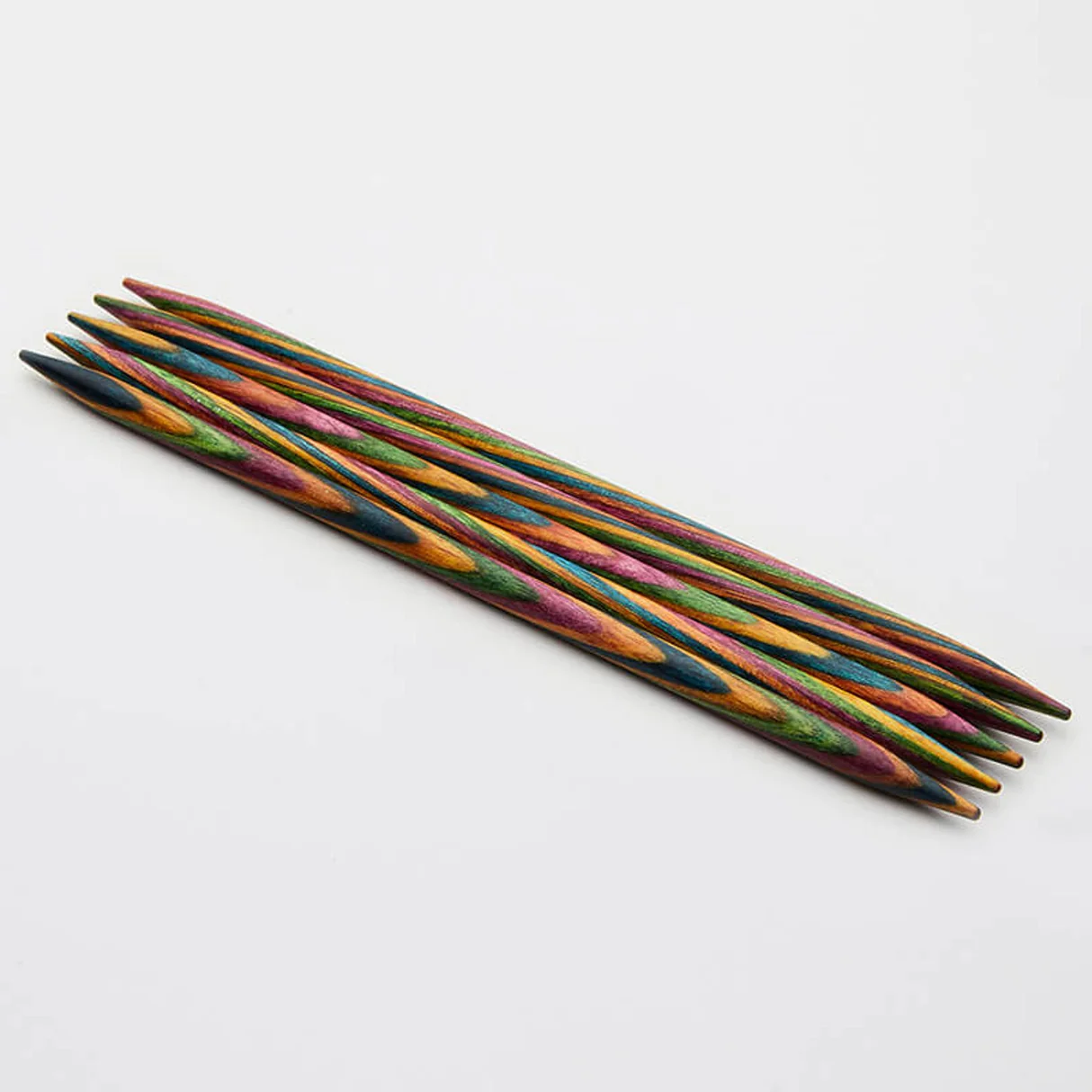 KnitPro Symfonie strumpstickor i laminerat björkträ. Lätta, hållbara och perfekta för strumpor och små projekt. Vacker, färgrik och slitstark design.